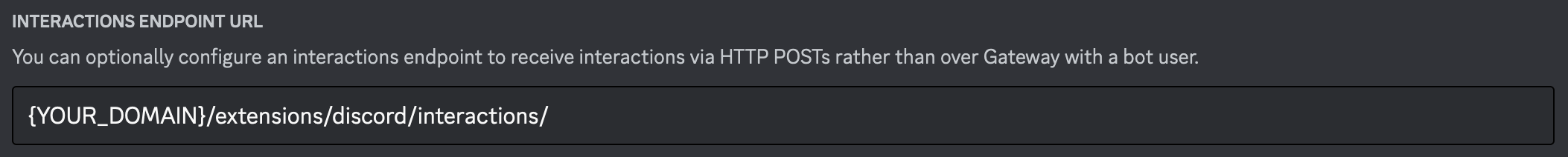 Interactions Endpoint URL: {YOUR_DOMAIN}/extensions/discord/interactions/